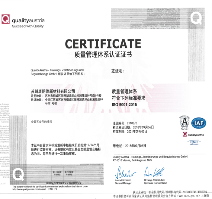 為了更好的使產品質量得到控制,使顧客更加滿意,內部管理水平得以提升,降低企業(yè)的管理成本并提高公司的工作效率,蘇州康朋德大力在內部推行ISO體系,讓公司管理更加系統(tǒng)和規(guī)范。并于2018年9月6日取得了認證。